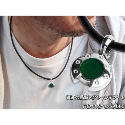 岐阜市のオリジナルブランド「ロッソエブルージュエリー」のシルバー メンズ ネックレス。幸運 モチーフ の シンプルなホースシューと邪気を払うグリーンアゲートの組合せ。