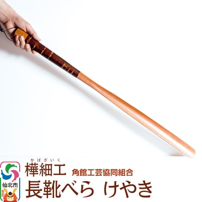 【伝統工芸品 角館樺細工 角館工芸協同組合】国産けやきを使用し、持ち手には桜皮をあしらっております。腰を曲げずに楽に靴べらを使用できるように、長さは70cmあります。