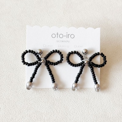 96きゅっと結んだビーズリボンのイヤリング【ブラック】