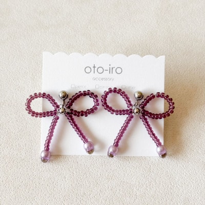 87きゅっと結んだビーズリボンのピアス【ribbon/パープル】