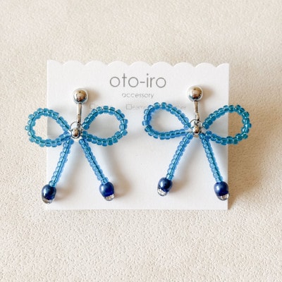 92きゅっと結んだビーズリボンのイヤリング【クリアブルー】