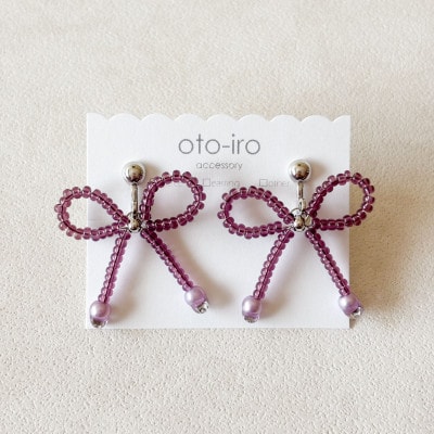 93きゅっと結んだビーズリボンのイヤリング【パープル】