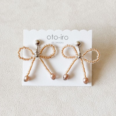 94きゅっと結んだビーズリボンのイヤリング【クリアベージュ】