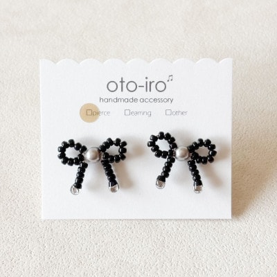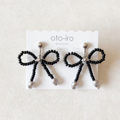 83きゅっと結んだビーズリボンのピアス【ribbon/ブラック】