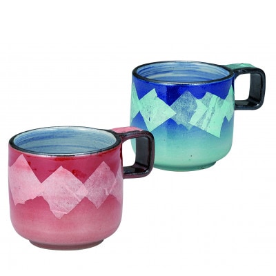 銀箔を貼り付けた上に作者独自の色(ブルーとレッドピンク)を塗り上げ、上品な輝きをしたペアマグカップ
