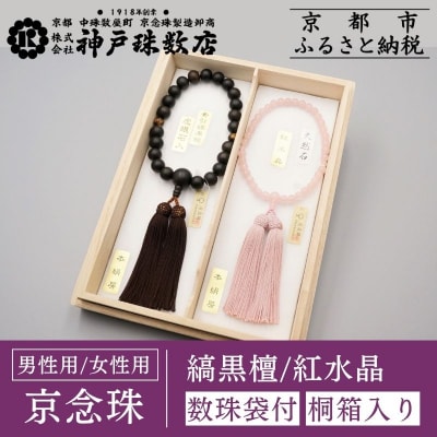 16【神戸珠数店】〈京念珠〉 縞黒檀 虎眼石入り 紅水晶 男性用数珠/女性用数珠セット【数珠袋2枚付き】