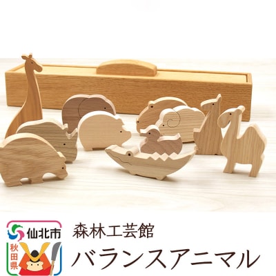<あきた芸術村 森林工芸館>木の動物たちとシーソーのセットです。ゆらゆら揺れるシーソーに動物たちをのせてバランス遊び!