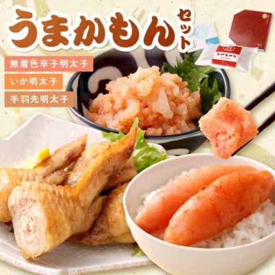 98うまかもんセット(樽入り無着色辛子明太子「匠」・いか明太子・手羽先明太子)【海千】_HA0344