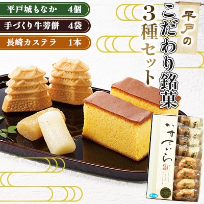 2平戸のこだわり銘菓3種セット (手づくり牛蒡餅4袋・平戸城もなか4個・長崎カステラ1本)