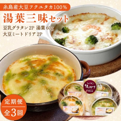 ※こちらは全3回定期便です。■湯葉好きにはたまらない!湯葉三昧のグラタンドリアセット大豆から取れる上質なタンパク質やミネラル、ビタミンで毎日の健康と元気をお届け!湯葉には、甘みが強く風味豊かな糸島産大豆「ふくゆたか」100%を使用。