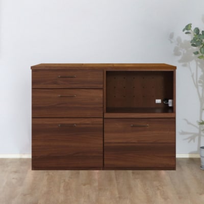 コンパクトサイズで場所がとらない製品です。完成品なので取っ手と天板を取り付けるだけですぐに使うことができます。カラーは木目のWN色で落ち着いた雰囲気に合う製品です。オープン部分はスライド天板がついております。オープン部の奥に1500Wの1口コンセントがついております。