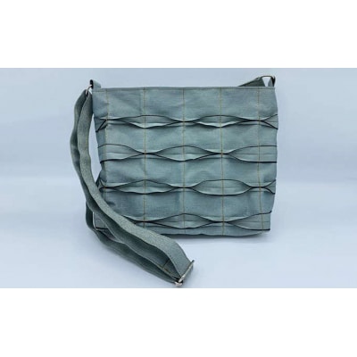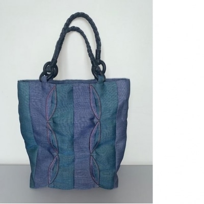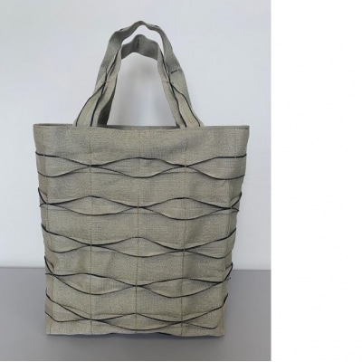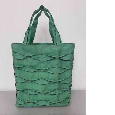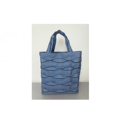 畳の「へり」がオシャレなバッグに大変身。1枚1枚はぎ合せ更に模様をつけて丁寧に縫い上げました。最大の特徴はその軽さ。重さは235gです。縦・横の方向によって色が変わって見える新感覚の2色(藍紺と緑)のへりを使ったオシャレなバッグです。※特定商取引に関する法律に基づく表記 意匠登録出願済