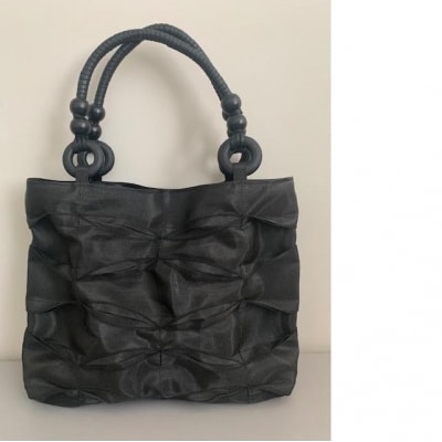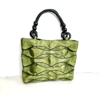 畳の「へり」がオシャレなバッグに大変身。1枚1枚はぎ合せ更に模様をつけて丁寧に縫い上げました。最大の特徴はその軽さです。重さは270g。光沢のあるへりを使い高級感を出し、和装、洋装どちらでもお持ちいただけます。また縫製にもこだわり、二重三重の工程で手間ひまかけ、一つのバッグに仕上げました。カラーは黒・ティーグリーンの2色です。※特定商取引に関する法律に基づく表記 意匠登録出願済