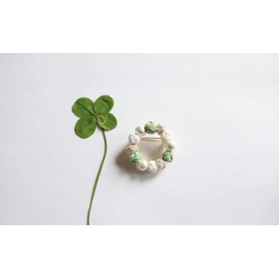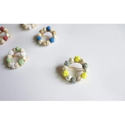 水引で作ったブローチを御用意しました。子供の頃夢中になって編んだ花かんむり。そんな懐かしく素朴な花かんむりを水引で表現しました。こちらはシロツメクサをイメージした配色。爽やかであわせやすいカラーです。