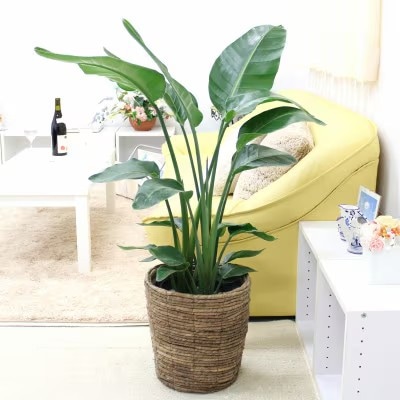 【3株植えのストレリチア オーガスタです。】南国のやさしさ伝わる観葉植物のオーガスタです。リビングルームやオフィスなど飾ったお部屋が、いっきに生き生きとした空間にかわります。飾ると南国のゆったりとした時間が流れている雰囲気が楽しめ、ナチュラル感のあるバスケット鉢カバーをセットしてのお届けになります。