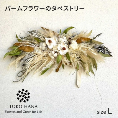 パームフラワーやパンパスグラスを使ったホワイト系タペストリードライフラワーとして人気のパームフラワーを使用した大きなタペストリーはお部屋を華やかに演出します。