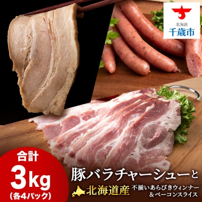 54豚バラ チャーシュー・不揃いベーコン・不揃いウィンナー 各4袋 アソートセット≪ 肉の山本 ≫