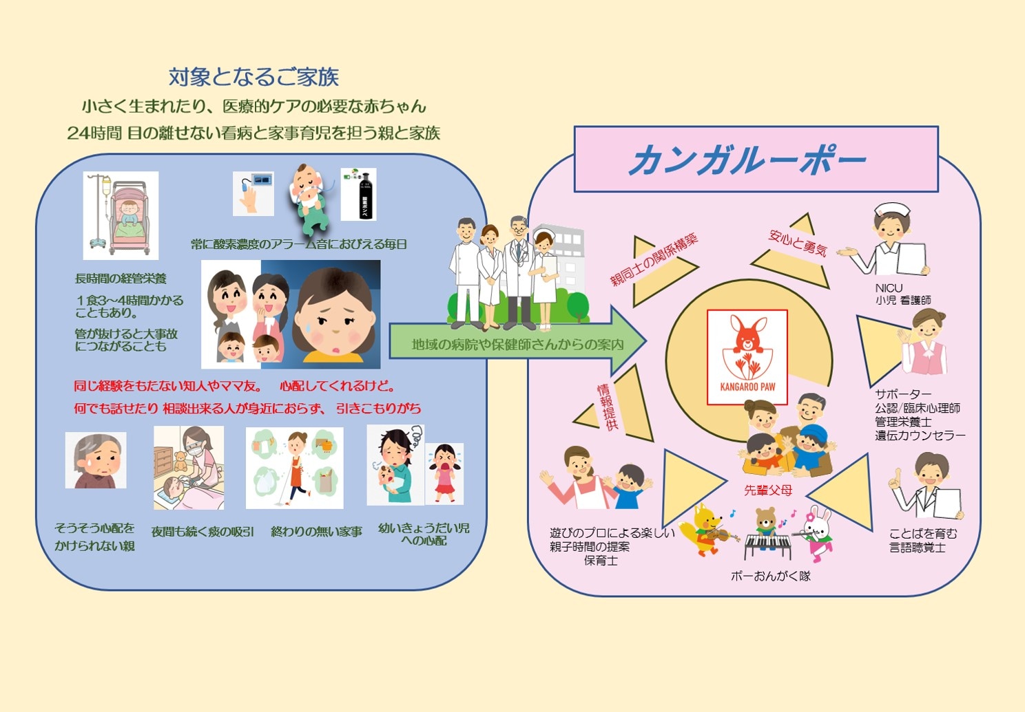 「NICUを卒業してからは1日中子どものケアに追われていました。心を打ちとけて話す相手がなく 通院以外に出かける場所もなくて。不安でつぶれてしまいそうで もう地獄でした。生まれて1年余りが、今までで一番辛かったです」こんな声からカンガルーポーが生まれました。