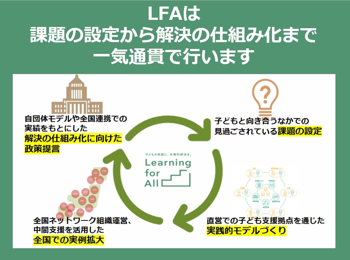 LFAは、居場所や学習支援の拠点運営を通して「モデルづくり」を行い、他団体との連携やナレッジ共有を通して「モデルの全国展開」を推進、その上で、確かな実績を基に政策提言を行い「法制度改革」の実現を目指すことを事業の軸としています。