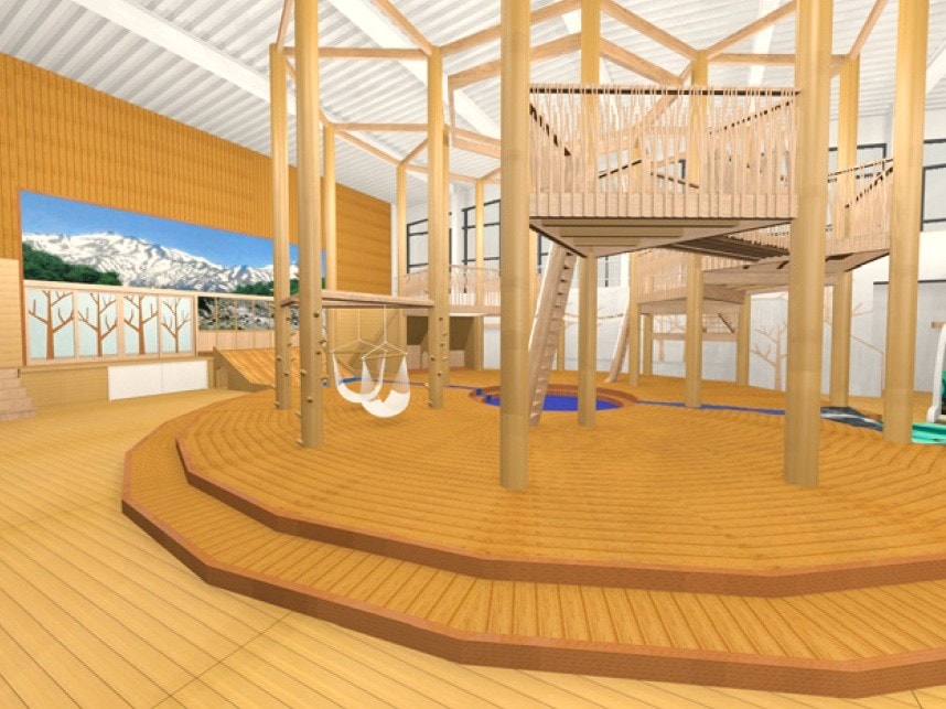 施設は体育館の広い空間に大型の木製遊具を配置し、平面だけでなく立体的な遊び場を創出します。また、郡上市は清流長良川の源流があり、木だけでなく、山から川を経て海へ繋がる自然の大きな循環を子どもたちが体験できるコンセプトを掲げています。