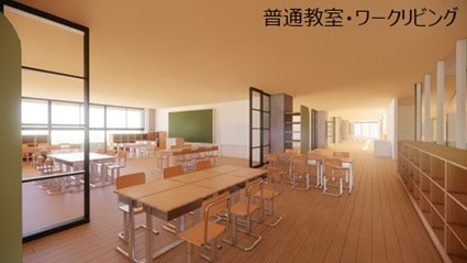地域の方の講演やコミュニティスクールの会議など、学校と地域が支え合い協働していくための空間「地域リビング」をエントランスホールと隣接して一体的に整備します。