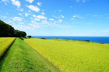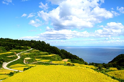 佐渡市は、2011年6月に「トキと共生する佐渡の里山」として、日本で初めて「世界農業遺産(GIAHS)」に認定されました。評価されたのは、田んぼの生態系に配慮した「生きものを育む農法」の取組みや棚田などの美しい景観、昔から受け継がれている伝統的な農文化であり、GIAHSのランドマークとして岩首昇竜棚田が使われています。