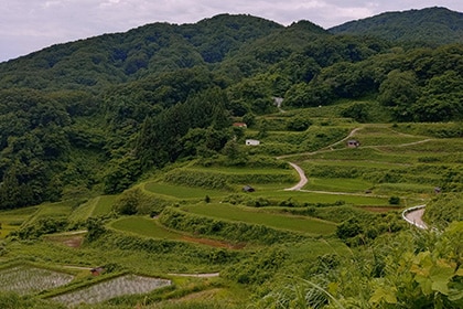 新潟県の魚沼地域は、日本有数の豪雪地であり、春には山からのミネラルたっぷりの雪解け水が大地を潤します。河岸段丘が作り出す地形に田んぼが広がる、日本有数の米どころです。