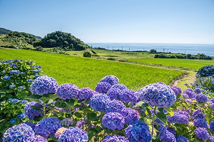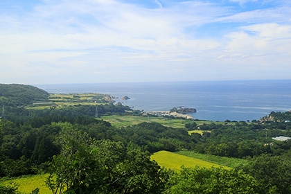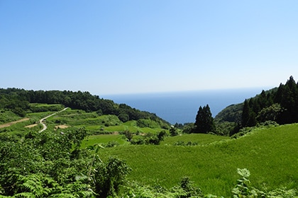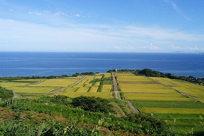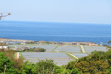 海と山に隣接する県道沿いの海岸段丘に3か所ある達者棚田からは、目の前に広がる水平線を見渡すことができます。
