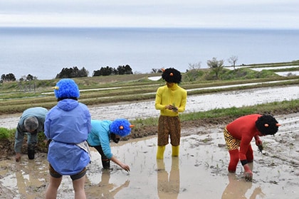 隣の黒姫集落には、鬼が田植えを手伝い、その田んぼが豊作になったという「鬼の田植え」の民話があり、田植えの時期には、その民話をモチーフに、地元小学校と共同で鬼に扮して田植えを行うイベントが行われます。ほかにも、新潟大学と連携した農作業の省力化に関する研究や生きもの調査、秋の稲刈りイベントなどが行われ、地域内外の人々による協力体制が生まれています。