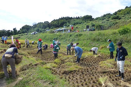 会員は田植え、草刈り、稲刈り、脱穀の各イベントに参加し、収穫した棚田米はすべて受け取ることができます。また、農業イベントへの参加は自由で、棚田米のみ受け取れるコースも用意されています。現在、約100組の会員が参加し、姨捨の棚田を拠点に、都市と農村の交流が生み出されています。