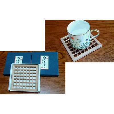 五城目の木工職人手作りの組子コースターです。天然秋田杉と神代杉の組み合わせです。組子を楽しむと共に、パッケージを開いた時の木の香りも楽しんで下さい。格子になっているので水滴が付いても持ち上がる事がありません。コンパクトなので贈り物、お土産にもぴったりです。