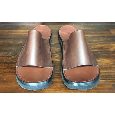 【五城目の革職人のハンドメイド!キャッスルファイブレザーアート】自社ロゴ入りのレザーサンダルです。裁断、床面処理、縫製(手縫い)まで、1つ1つ妥協せず丁寧に手作りしています。使い込むほど、なじんできますので、自分だけの風合いを楽しめます。牛革使用で使うほどに味が出ます。
