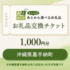 沖縄県嘉手納町のあとから選べるお礼品【お礼品交換チケット1,000円分】が付与されます。付与されたお礼品交換チケットは沖縄県嘉手納町が指定するお礼品と交換が可能です。