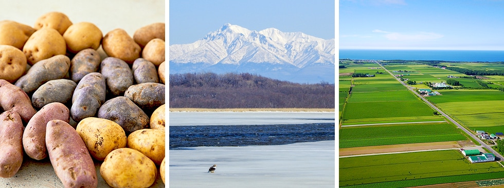 農業の最盛期である夏から秋にかけて「じゃがいも街道」と名付けられた道路沿いから斜里岳や知床連山、見渡す限り耕地風景が広がり“これぞ北海道”と言える雄大な風景が望めます。この耕地は、日々農家の方が健康な土づくりに尽力され、北海道内でも屈指のじゃがいも・小麦の一大産地として知られています。