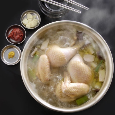 家族で楽しむタッカンマリ(韓国風水炊き)セット。じっくり煮込んだ鶏をハサミで切り分けて濃厚スープで。