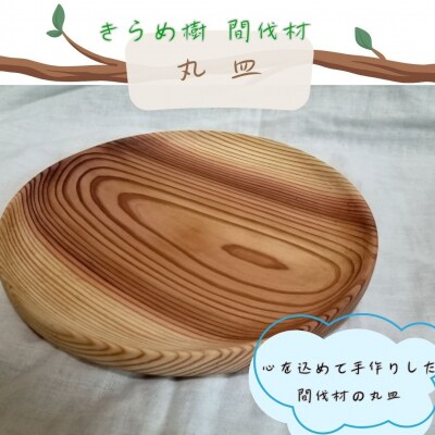 "皮むき間伐"という方法によって伐り出された間伐材から製作した、縁のついた丸皿です。無垢板から1枚ずつ削って制作していますので、それぞれ違った木目を楽しんでいただけます。