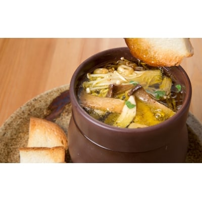 中国地方の針葉樹と伏流水で育った安心・安全なキノコを使ったアヒージョセットです。オリーブオイルに八頭町産にんにくと鷹の爪を入れ、風味が出たら干し海老、天然塩を投入。キノコがぐ~んと美味しくなります!