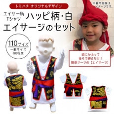 子供用エイサー柄Tシャツ【ハッピ柄・黒】150サイズ&エイサージ(頭巾)&オリジナル締太鼓のセット